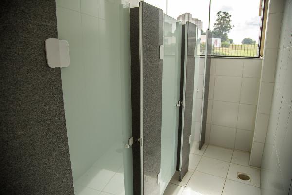 Refeitório e cozinha com armários e varias mesas. Banheiro e vestuário feminino e masculino. Mezanino para escritório, banheiro administrativo. Com dois hidrantes, alarme para incêndio, iluminação de emergência e extintores de apoio, tudo com sinalização exigida pelos bombeiros. Galpão fechado com muro de 3 m de altura.